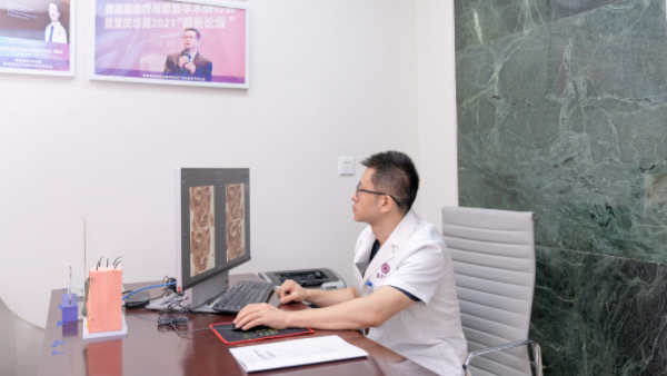 在学术交流舞台上,他同样活跃:2025问题肌肤诊疗创新学术论坛上,他分享复杂病例诊疗思路;痤疮疤痕国际交流论坛中,他与美国激光与外科学会副会长Gilrish教授深度探讨技术突破,将国内复杂痘坑修复的经验推向国际,持续吸收前沿理念反哺临床,而毕建军院长联合治疗的技术性突破也获得了Gilrish教授的认可。